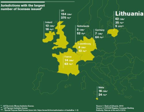 - 2019-ben 5 különleges célú banki engedélyt (Specialized Banking License) adott ki a Litván Nemzeti Bank.